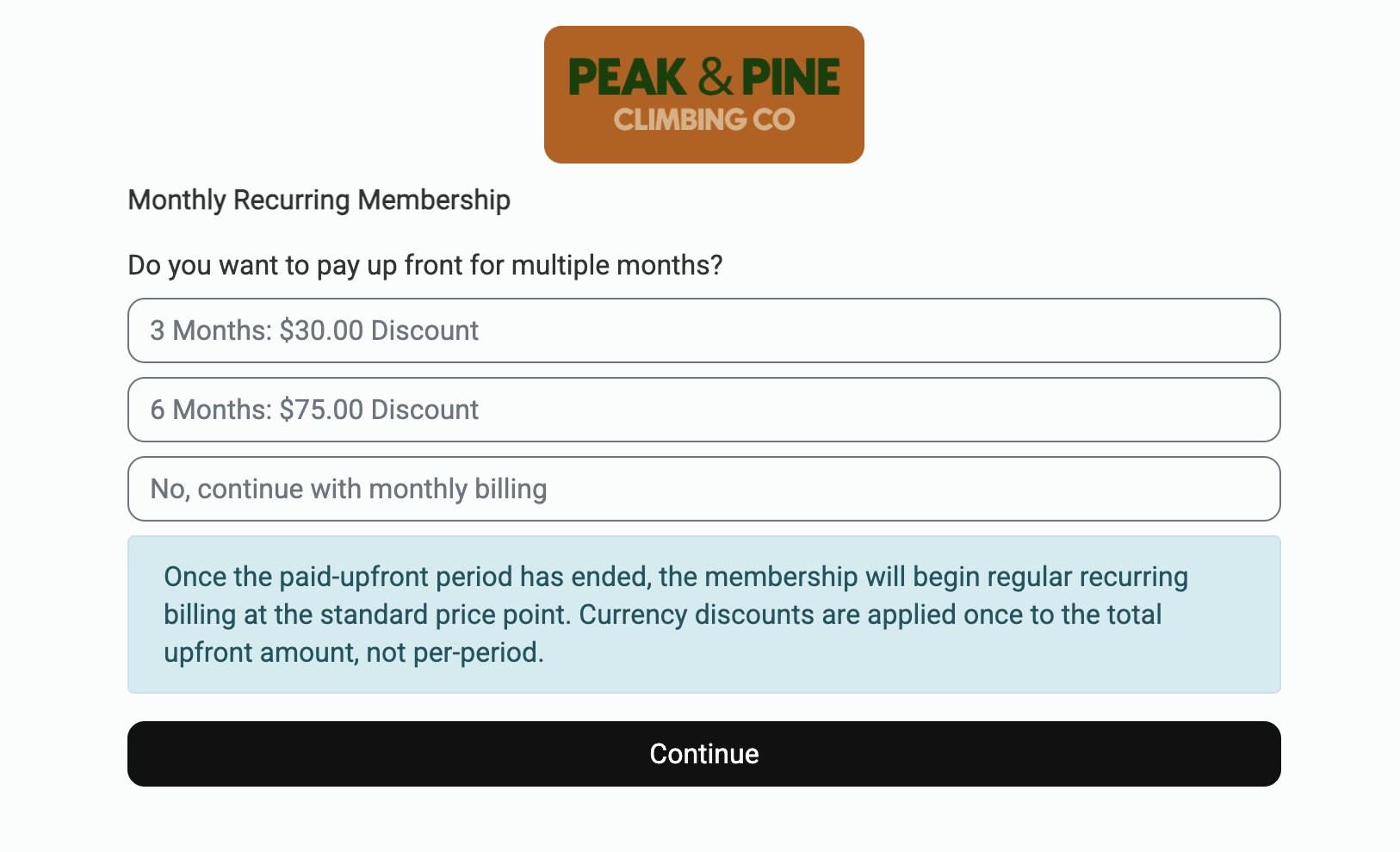 If upfront payment options are configured, when a customer is purchasing a recurring membership, they will see the upfront options along with their associated discounts.